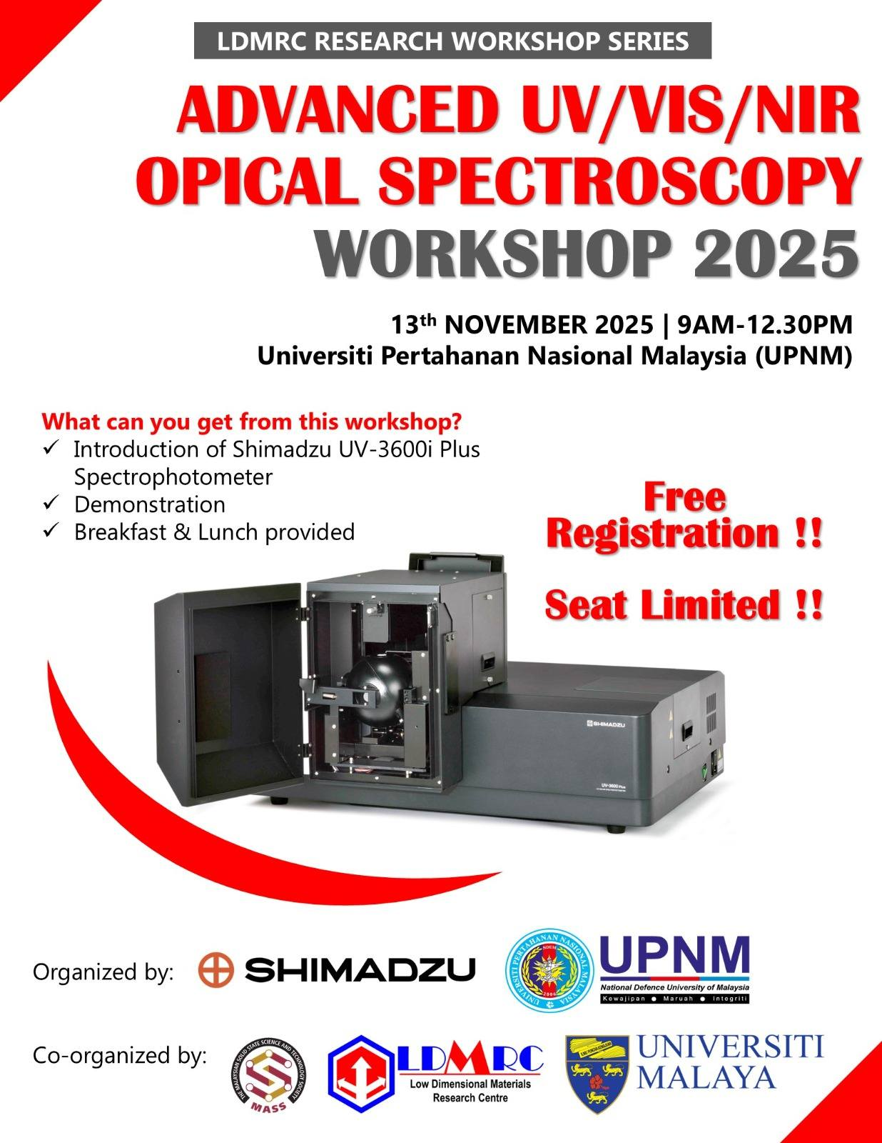 13-November-2025: We have successfully organized the LDMRC Research Workshop Series: Advanced UV/VIS/NIR Optical Spectroscopy Workshop 2025 in collaboration with Shimadzu (M) Sdn Bhd and Universiti Pertahanan Nasional Malaysia (UPNM).
