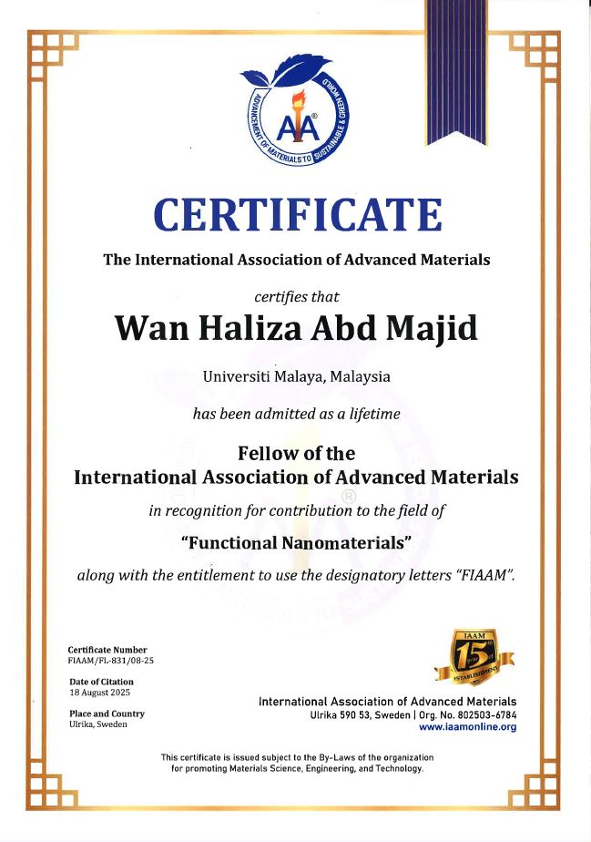 18-Aug-2025: Congratulations to our Head, Prof. Dr. Wan Haliza Abd Majid, for being admitted as a Lifetime Fellow of the International Association of Advanced Materials. As part of this honor, she delivered a Fellow Members Lecture at the 65th Assembly of the Advanced Materials Congress (European Fellow Summit) held in Stockholm, Sweden.